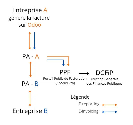 L'entreprise A génère la facture sur Odoo et Odoo la transmet à la Plateforme Agréée choisie par l'entreprise A. La PA de l'entreprise A enverra les informations liées à la facturation électronique à la PA de l'entreprise B. La PA-A a l'obligation d'envoyer certaines données fiscales (e-reporting) au PPF. Le PPF (Portail Public de Facturation) centralise ses informations et les transmet à la DGFiP pour le suivi de la TVA et des transactions.
